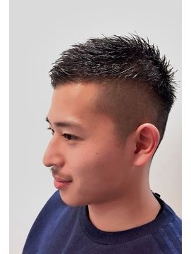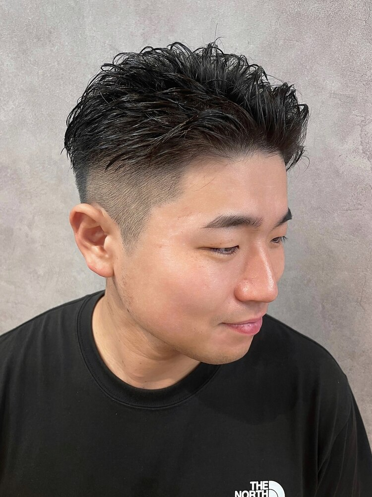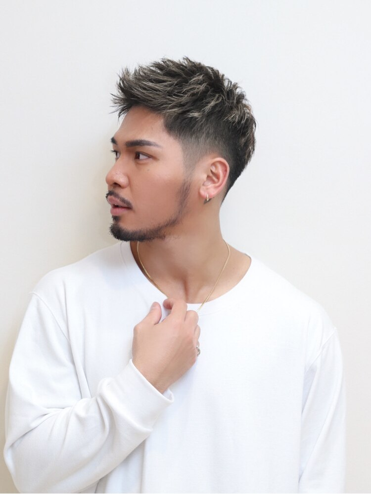 サイドや襟足はフェード状のツーブロックに整え、トップにはツンツンとした束感でカジュアルさをプラス。