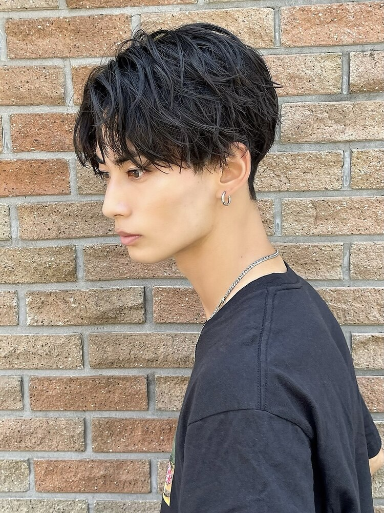 サイドから襟足の広い範囲をツーブロックに刈り上げ、トップにはパーマを加えることで、立体感のあるシルエットを演出できます。